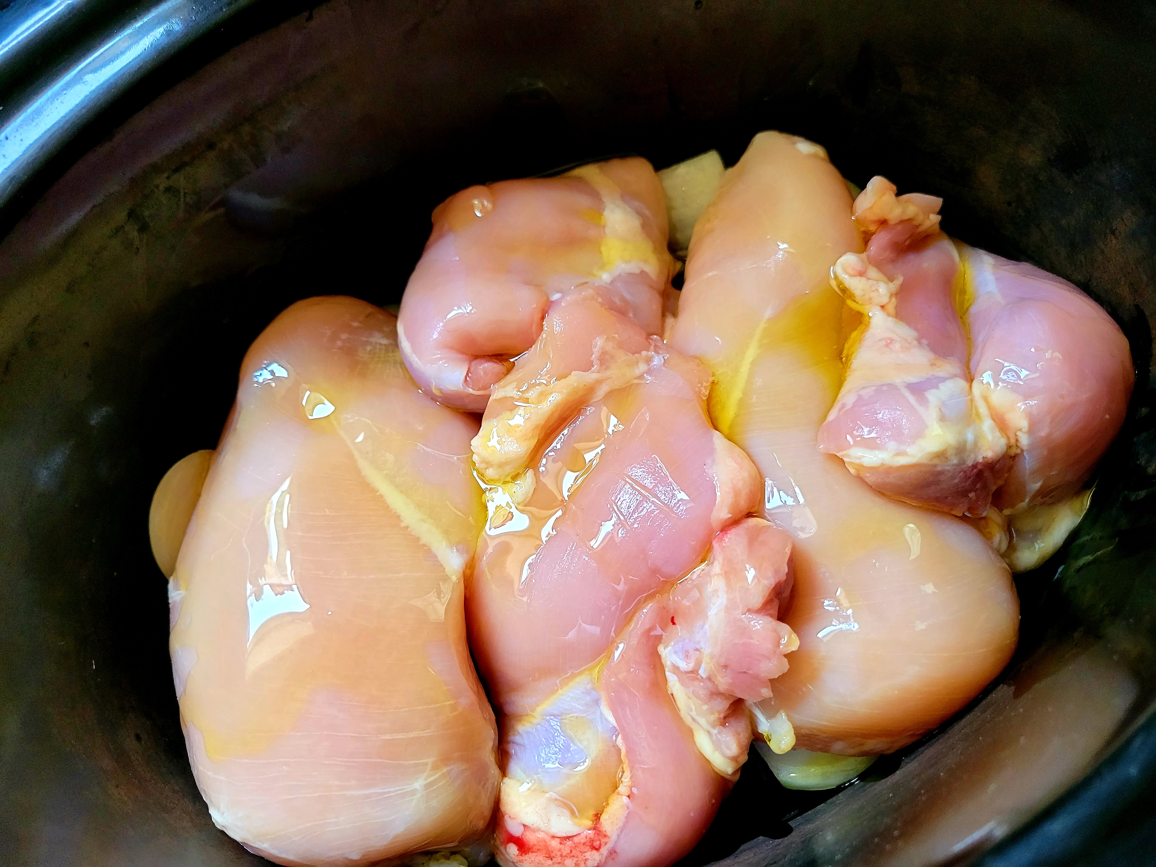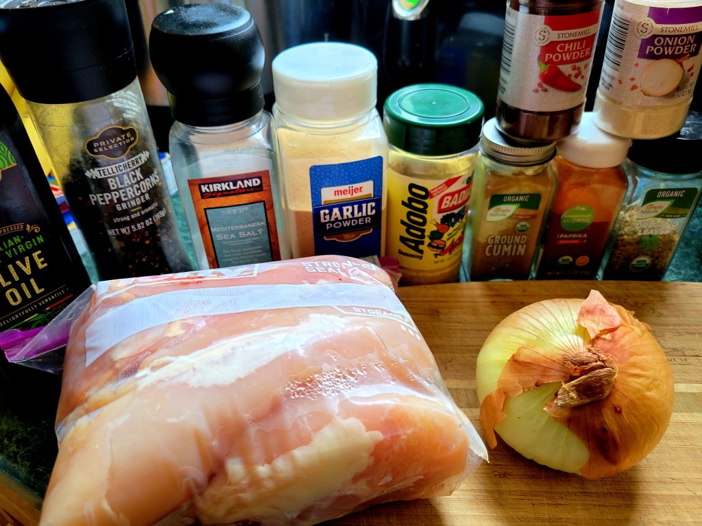 A little olive on the bottom of the crock and on the chicken directly help add some fat, and the onions will steam up through the meat to keep it from drying out. Then you add a nice helping of adobo seasoning and taco seasoning (both can be premixed or made to your liking).