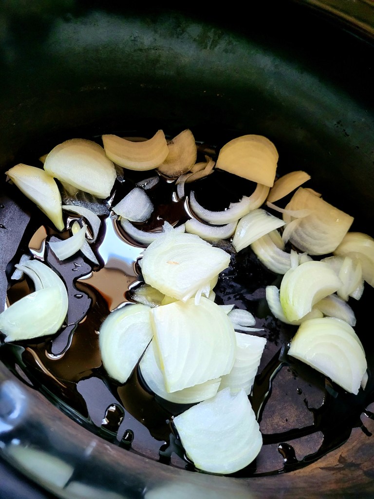 1. Add 1 tbsp of olive oil and onion to slow cooker, place chicken on top and add drizzle with the rest of the olive oil.