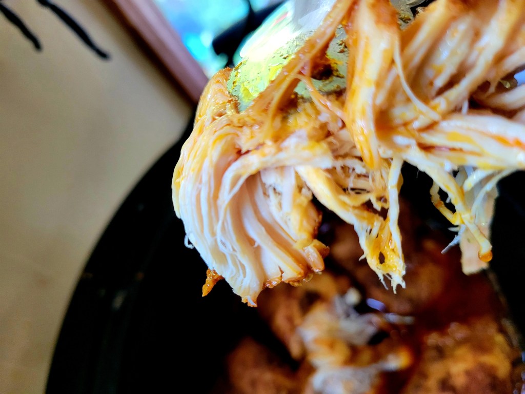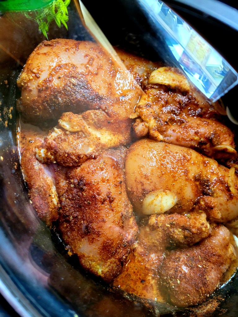 Rub the seasonings all over the chicken to coat thoroughly and ensure that flavor works its way into each part. I also add about half a cup of water to make sure the chicken comes out a bit saucy. Set it on low for 6-8 hours and what you end up with…