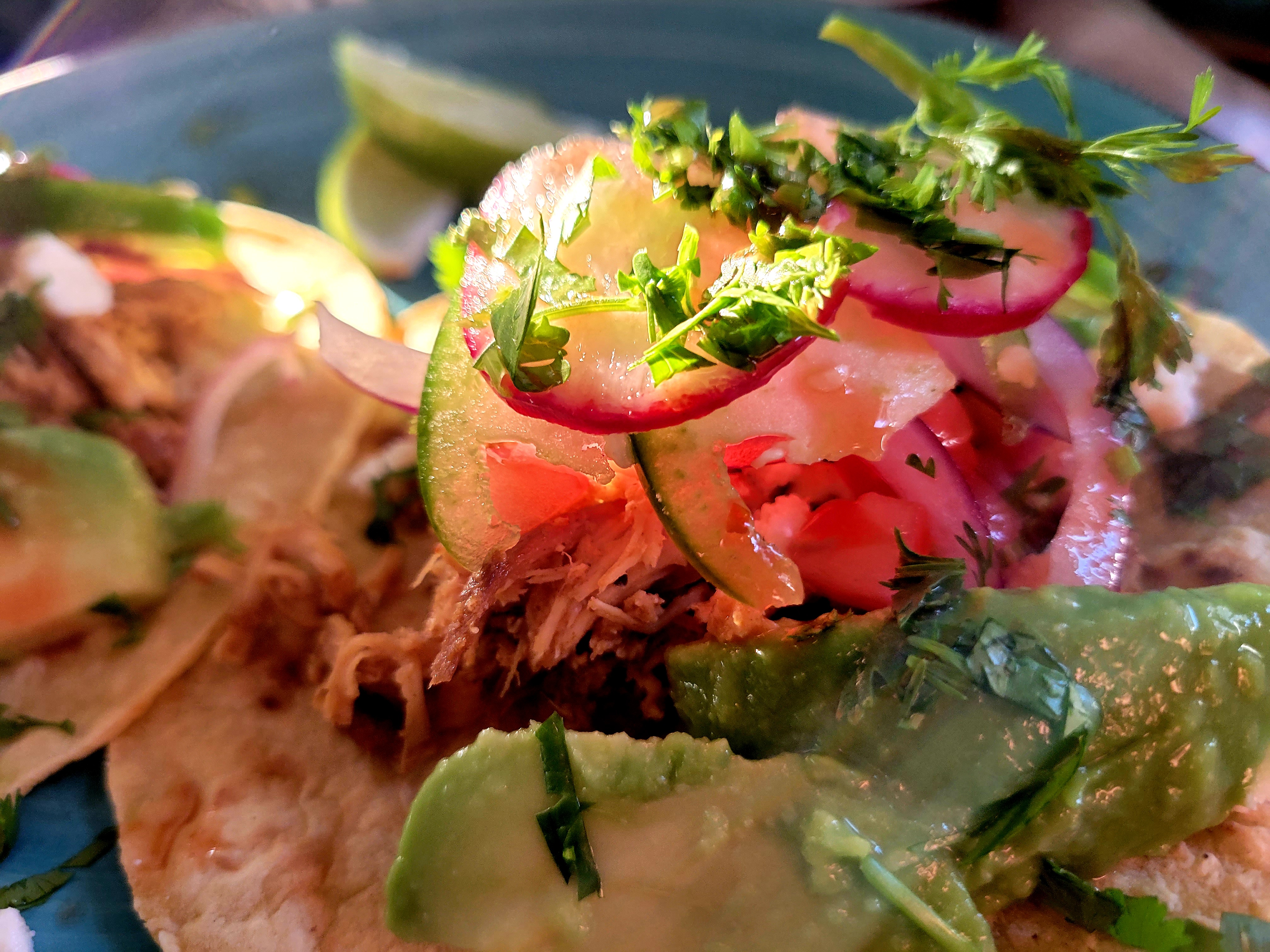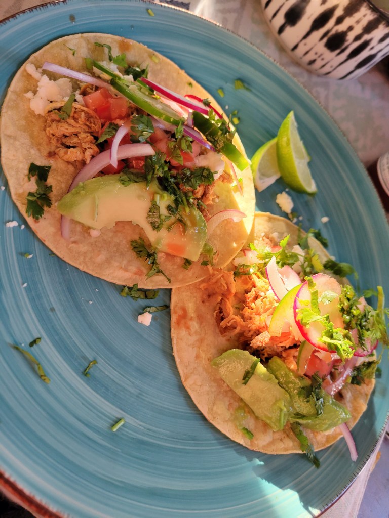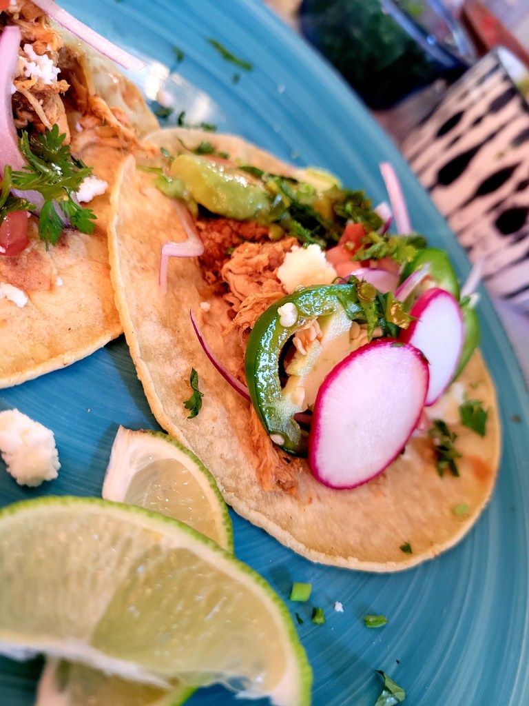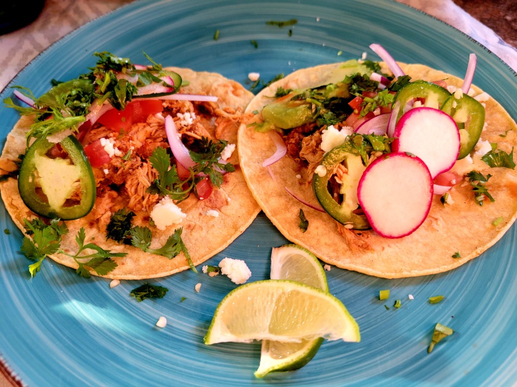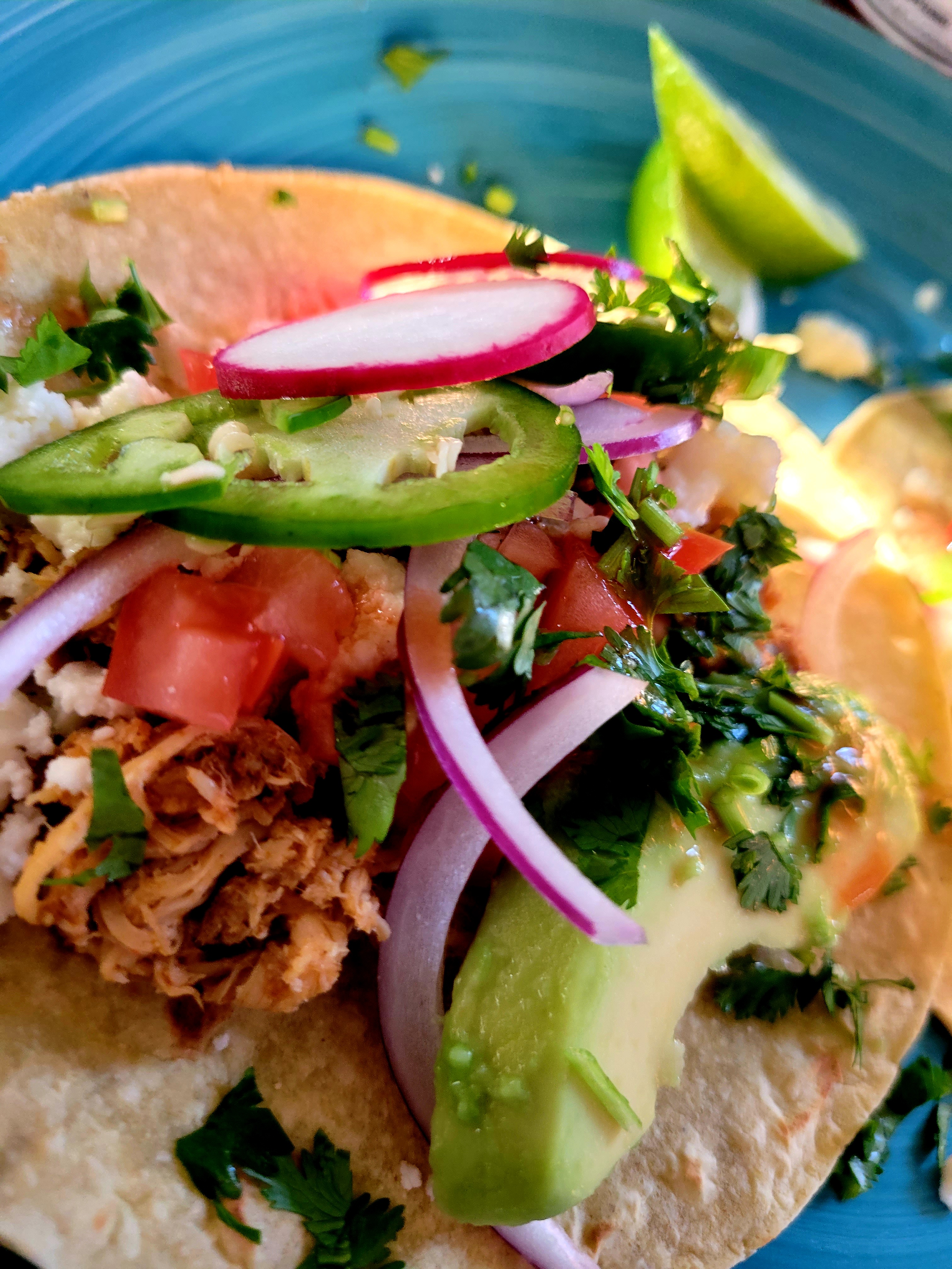 I went with some more traditional garnishes (radish, red onion, cilantro, tomato, avocado, and queso fresco) and yellow corn tortillas. This chicken is also amazing in burritos, enchiladas, over rice, or even in a taco salad!